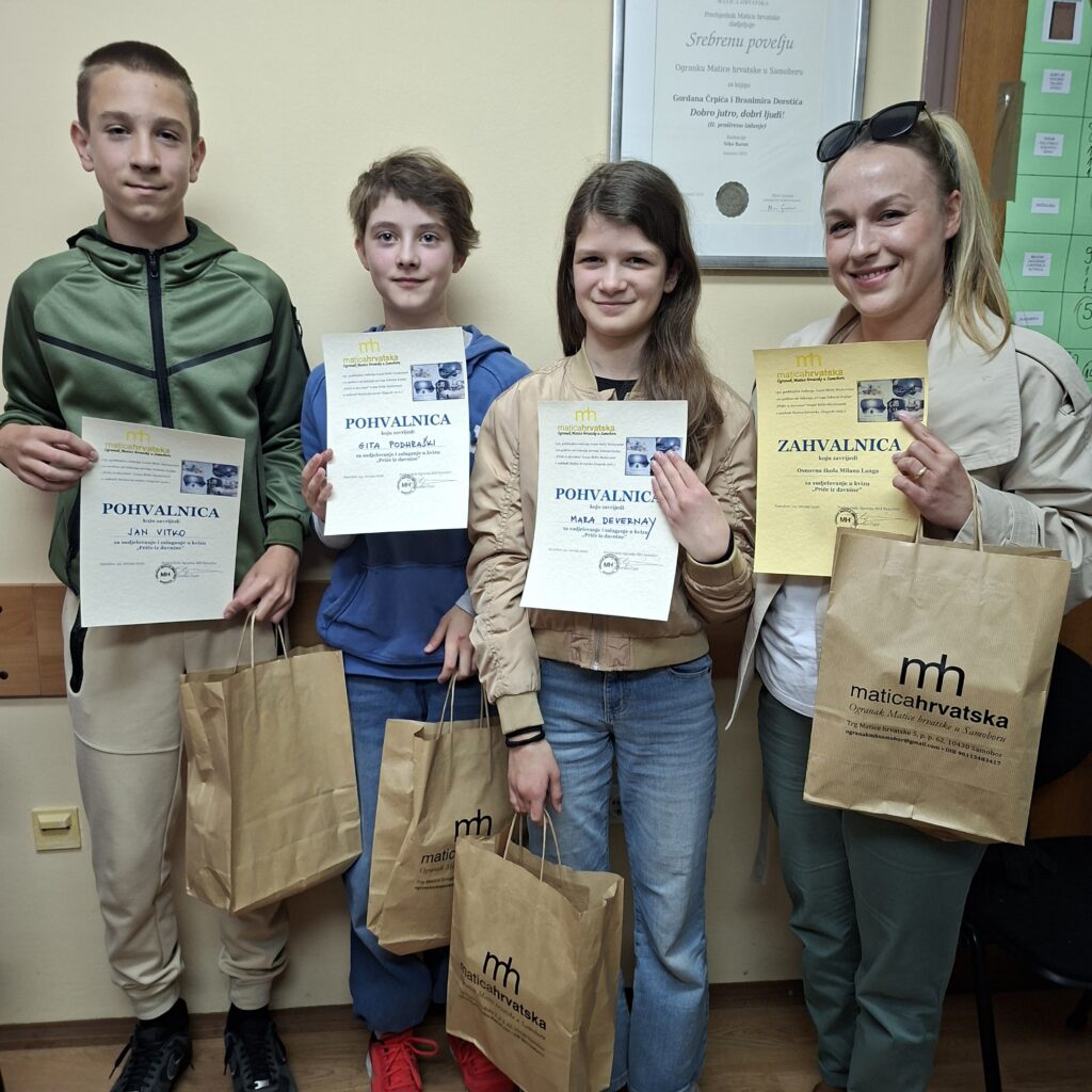 Učenici 6. razreda Mara Devernay, Gita Podhraški i Jan Vitko predstavljali su našu školu na kvizu Lektira za učenike osnovnih škola Samobora i Svete Nedelje. Kviz se održao u Ogranku Matice hrvatske u Samoboru, a ovogodišnja zadana lektira bile su Priče iz davnine Ivane Brlić-Mažuranić, koje ove godine obilježavaju 110 godina od tiskanja prvog izdanja u nakladi Matice hrvatske. Učenici su se za kviz pripremali sa školskom knjižničarkom, a na kvizu su pokazali odlično znanje te osvojili 2. mjesto.